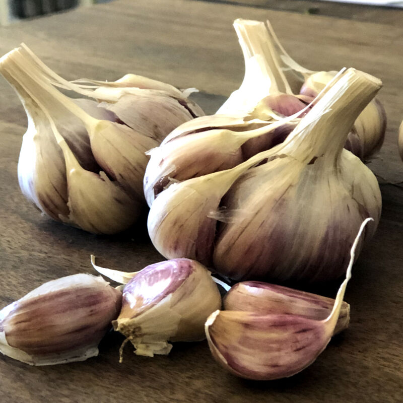 (Allium sativum var. ophioscorodon) Heirloom from France. Artichoke type. A mid-season garlic with lively flavour which persists even when cooked o