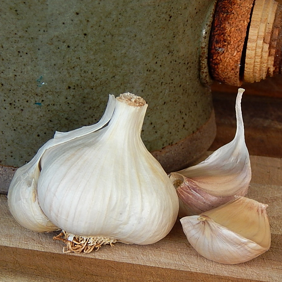 (Allium sativum) Pure white, occasionally with purple blotching or striping especially in cooler areas, with creamy white to tan coloured cloves. Gr
