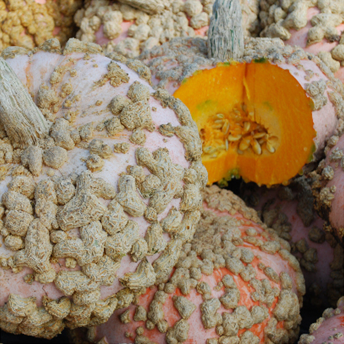 (Cucurbita maxima) Italian heirloom. Highly attractive, large, grey-green, heavily ridged & bumpy fruits to 4.5kg with sweet, dry flesh. Flavour impro
