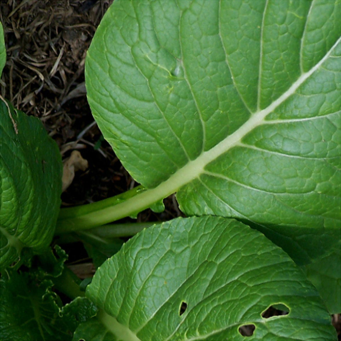 (Brassica juncea) Japanese heirloom. Leafy vegetable with large flat green, crisp leaves with curly edges and rounded stems. Leaves become spicier